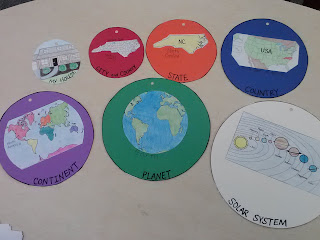 In Social Studies, we study a lot about community. We also have map skills and one skill is to give the general and specific location of a place. So, we made circles that showed the different names for where we live (My house, City, County, State, Country, Continent, Planet, and Solar System). We tied in solar system to go with our science! They turned out really cute. Here's a picture of my example, since I sent them home without taking a picture of all the circles.
